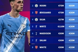 體育資訊12月25日訊 德國(guó)轉(zhuǎn)會(huì)市場(chǎng)公布了新一期的球員身價(jià)情況,進(jìn)入2025年后,英超多名球星身價(jià)出現(xiàn)大幅下跌。德國(guó)轉(zhuǎn)會(huì)市場(chǎng)盤點(diǎn)了2025年英超球員身價(jià)下跌榜,曼城兩將福登和羅德里分別下跌6000萬(wàn)歐元和5500萬(wàn)歐元位居前二。