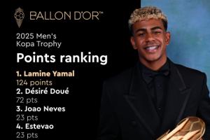 體育資訊09月27日訊 金球獎(jiǎng)官方今天公布了男子科帕獎(jiǎng)的得分細(xì)節(jié),其中亞馬爾124分成功衛(wèi)冕,以52分的優(yōu)勢(shì)領(lǐng)先于獲得72分的杜埃。阿森納小將斯凱利和里爾小將布阿迪未能在評(píng)選中獲得分?jǐn)?shù)。