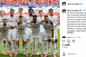 本場比賽受傷的卡瓦哈爾也在社媒曬出全隊合影鼓勵球隊,配文寫道:“這不是我們想要的結(jié)果。我們需要改進的地方還有很多,我們首先要進行自我反省。接下來的路就是繼續(xù)努力,從錯誤中學(xué)習(xí),并以更強的姿態(tài)重新站起來。賽季還很漫長,還有很多目標需要實現(xiàn)。Hala Madrid! ”