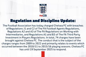 英格蘭足球總會(huì)今日對(duì)切爾西足球俱樂(lè)部提出指控,其違反《英足總足球經(jīng)紀(jì)人條例》J1和C2條款、《英足總中介合作條例》A2和A3條款,以及《英足總第三方球員投資條例》A1和B3條款。切爾西俱樂(lè)部共面臨74項(xiàng)指控,涉及2009年至2022年期間的違規(guī)行為,主要集中于2010/11至2015/16賽季期間。切爾西俱樂(lè)部需于2025年9月19日前就此作出回應(yīng)。
