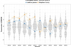 體育資訊9月12日訊 近日,數(shù)據(jù)媒體BBall-Index曬圖比較了2014-2025年期間詹姆斯和庫里的隊友強度。