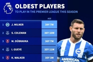 德轉(zhuǎn)列本賽季英超出場(chǎng)最年長(zhǎng)球員排行: