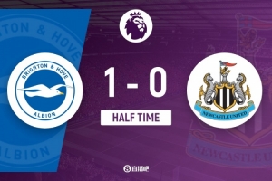 傷停補(bǔ)時5分鐘。上半場比賽結(jié)束,布萊頓1-0紐卡斯?fàn)枴?/p>