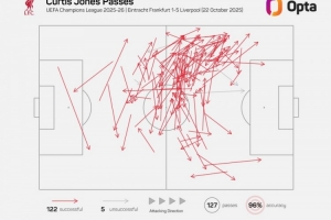 此役柯蒂斯-瓊斯為利物浦踢滿全場,成功傳球122次,這是2003-2004賽季Opta統(tǒng)計相關數(shù)據(jù)以來,利物浦球員歐冠單場成功傳球紀錄。