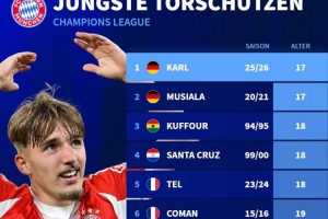 拜仁隊(duì)史歐冠最年輕進(jìn)球者排名:
