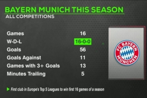 數(shù)據(jù)統(tǒng)計顯示,拜仁在本賽季各項賽事16戰(zhàn)保持全勝,打進56球、丟11球。有13場比賽能夠至少打進3球,本賽季共計僅有5分鐘處于落后。