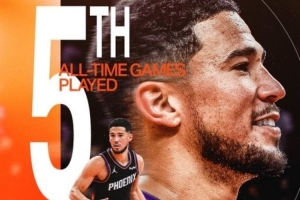 這是布克太陽(yáng)生涯的第684場(chǎng)比賽,超越凱文·約翰遜獨(dú)居隊(duì)史第五位,排在他前面的是迪克·范-阿斯代爾。