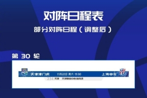 官方:中超第30輪津門虎vs申花調(diào)整在天津奧體中心體育場進行