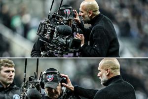 體育資訊11月23日訊 凌晨英超,曼城客場1-2不敵紐卡,賽后瓜迪奧拉被拍到與一名攝影師交流。