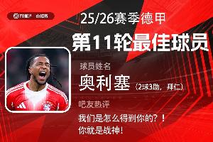 第十一輪評選結果結出爐,奧利塞2射3傳超神表現(xiàn),幫助拜仁讓2追6擊敗弗萊堡,獲得吧友超4.2萬票支持。奧利塞毫無懸念當選【體育資訊X小紅書德甲第11輪最佳球員】!