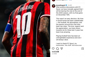 體育資訊12月5日訊 今日,首爾FC官方宣布林加德將在賽季結(jié)束后離隊,隨后林加德也在社媒發(fā)文,告別首爾FC。