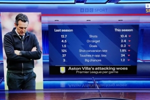 這是維拉本賽季5輪英超打進(jìn)的唯一進(jìn)球,BBC也盤點(diǎn)了維拉本賽季英超相較上賽季的場(chǎng)均進(jìn)攻數(shù)據(jù),可謂全面下滑,具體如下: