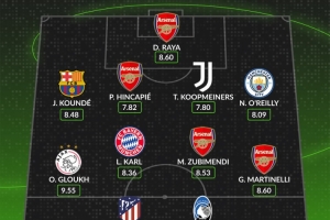 體育資訊12月11日訊 WhoScored根據(jù)球員的評分列出了歐冠第6輪最佳陣容,馬丁內(nèi)利、卡爾、孔德、拉亞在列,阿森納4名球員入選。