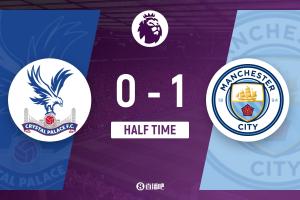 上半場(chǎng)傷停補(bǔ)時(shí)3分鐘,半場(chǎng)結(jié)束,曼城暫1-0水晶宮。