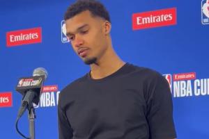 賽后發(fā)布會,文班接受采訪,第一個問題他眼眶泛紅全是淚水,用哭腔說著:“對不起,我今天失去了一位親人?!?/p>
