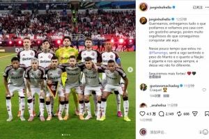 弗拉門戈中場(chǎng)若日尼奧社媒曬出首發(fā)球員的合照,配文:“我們奮力拼搏,傾盡全力,雖然帶著些許遺憾踏上歸途,但仍對(duì)迄今取得的成就感到無(wú)比自豪。”