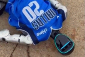 視頻中一個(gè)穿著獨(dú)行俠球衣的機(jī)器人正在施展回旋踢等招數(shù),歐文溜過(guò)來(lái)使勁推了一把,機(jī)器人應(yīng)聲倒地沒(méi)了動(dòng)靜。