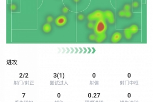出場(chǎng)63分鐘,進(jìn)1球,射門2次,射正2次,嘗試過人3次成功1次,丟失球權(quán)7次,預(yù)期進(jìn)球0.27