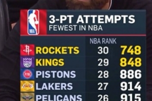 火箭客場挑戰(zhàn)國王,轉(zhuǎn)播方給出統(tǒng)計,本場比賽之前,火箭本賽季三分出手748次聯(lián)盟倒數(shù)第一,國王848次倒數(shù)第二。